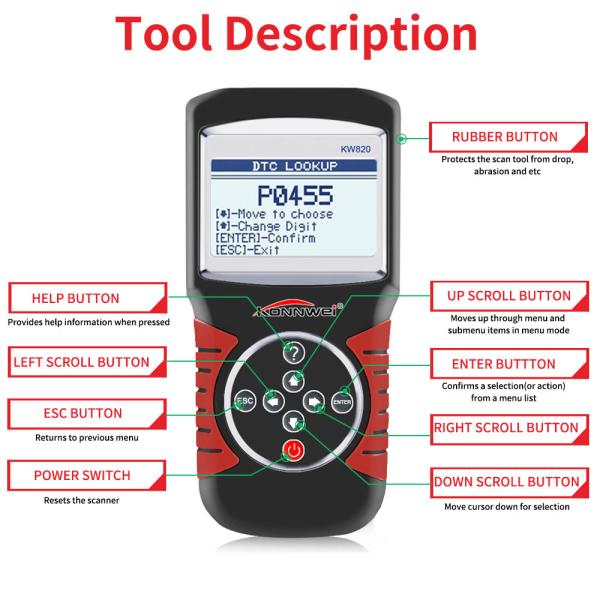 The KW820 OBDII/EOBD Code Reader supports all nine OBDII test modes on all OBDII EOBD compliant vehicles to enable technicians and home users to accurately diagnose even the toughest problems. Sophisticated yet easy-to-use, this hand-held scanning tool enables fast and easy access to engine based EOBD Fault codes, The CAN enabled tool gives clear, concise DTC definitions on its large back-lit LCD screen retrieves generic P0, P2 and P3 and U0 codes for engine emissions and also picks up manufacturer specific P1, P3 and U1 codes, Turns off MIL light, Stores freeze frame data for later evaluation and will also display monitor and I/M readiness status.
